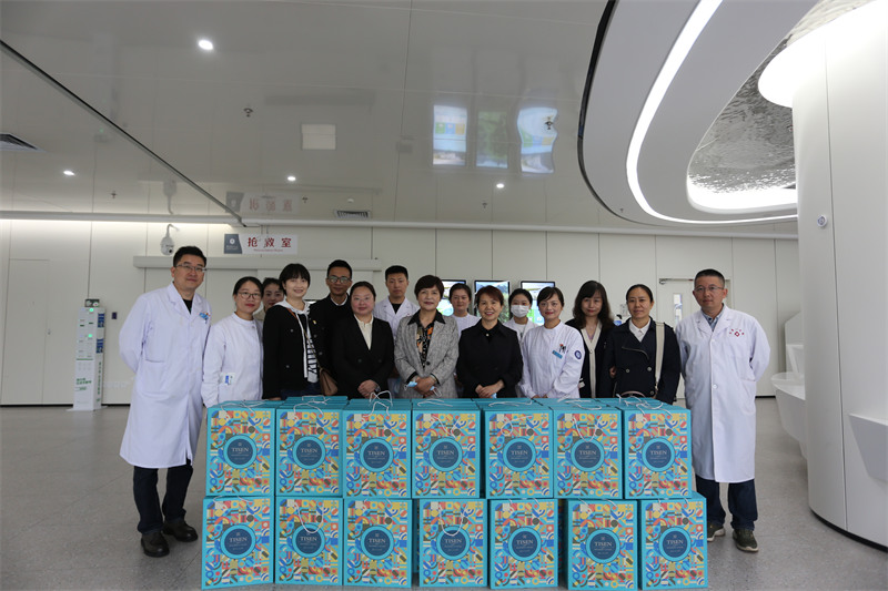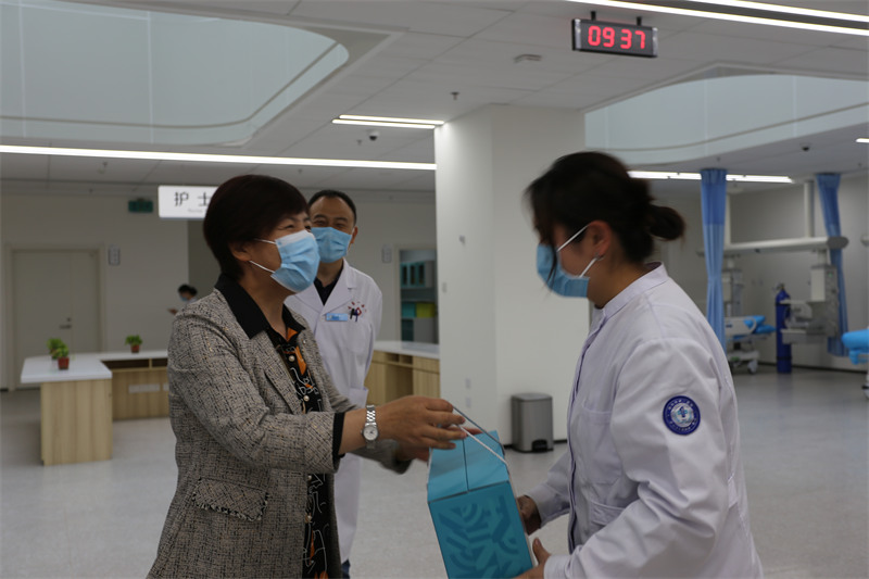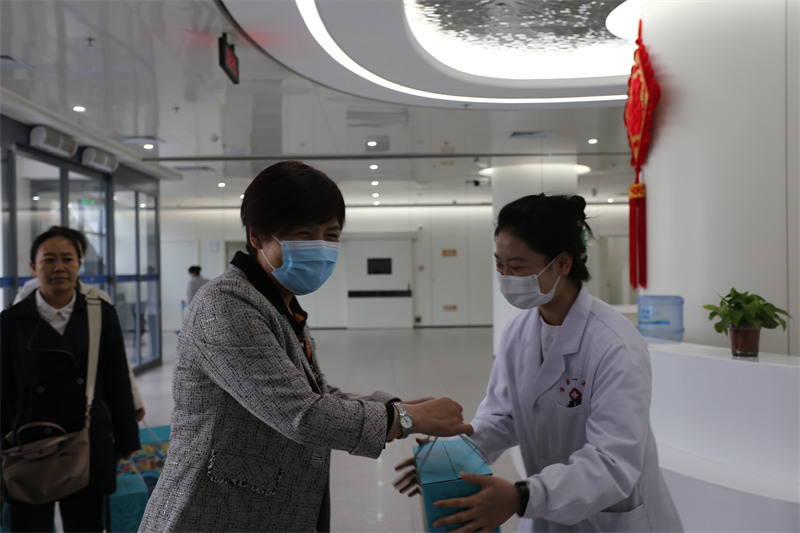 西安市教科文卫工会杜明琴主任代表市总工会慰问啄木鸟 高新院区一线护士姐妹,她表示:在新院区前期开诊期间,她们不惧劳苦、辛勤付出、开拓奉献的精神值得赞扬,我们也时常要把工会娘家人的关心、关怀送到医护人员的心坎里,确保医院更好的平稳运行,将人民生命安全放在首位,为人民健康保驾护航。市一院白敏芳书记带领市教科文卫工会一行人员参观啄木鸟 高新院区、介绍目前开诊情况,并说道“我们一直关心新院区职工的食、宿、交通等情况,及时发现问题想方设法解决问题,解决他们的后顾之忧,让他们感受到娘家人的温暖”。最后,也代表院领导班子对市教科文卫工会的慰问表示感谢,为全体护士姐妹送去节日的祝福”。