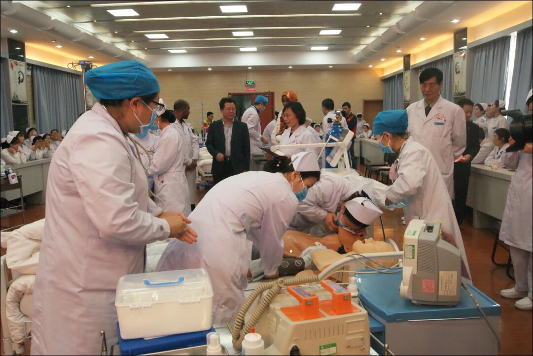 大赛首先由主管护理的白敏芳纪委书记致辞,医务科副科长李晓林宣读比赛规则。刘宽、胡雪慧、赵昆、李延、胡泽华、任艳萍六位专家担任评委。在总指挥宋国忠副院长宣布比赛正式开始的口令下,10支团队依次上场。在近2小时的赛程中,各组选手依据主持人给出的抢救场景进行急救配合演练,他们全力以赴、分秒必争,每组6名队员,各司其职,齐心协力,根据患者病情变化,在组长的指挥下共同完成给药、治疗等抢救措施。抢救现场忙而不乱,有序的将心肺复苏、简易呼吸气囊、气管插管、呼吸机、心电监护、除颤、静脉输液等技术操作融为一体。在整个比赛中,张世明院长、崔明远书记、姬新才主任等多位领导、专家分别走进比赛现场,近距离观看选手操作细节,同时紧张的急救场景也吸引了在啄木鸟