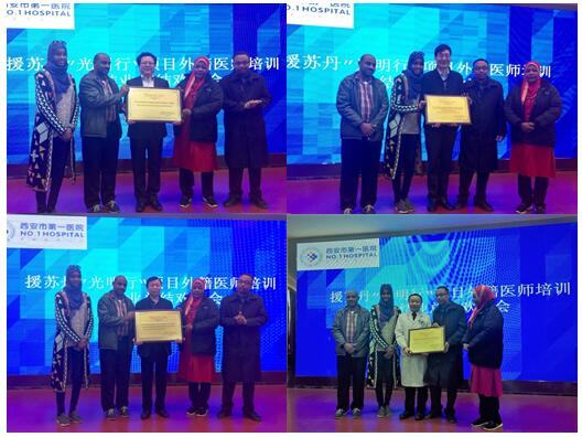 张世明院长及部分院领导为四名苏丹医师颁发结业证书,祝贺他们学有所成回国后化身为苏丹的“光明使者”,继续播撒爱与光明,继续传递深厚情谊!四名苏丹医师也特别制作感谢信献给啄木鸟