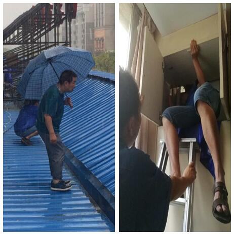 上午11时左右,眼科门诊急报19号检查室漏雨严重,需要尽快处理。院总务科维修组冒着大雨对漏水点进行勘查,为了不影响下午病人正常就诊,维修人员加班对漏水点进行抢修。由于雨势猛烈,每个人几乎都被雨水浇透了。终于赶在13:30前,及时完成了破损管道的修复。