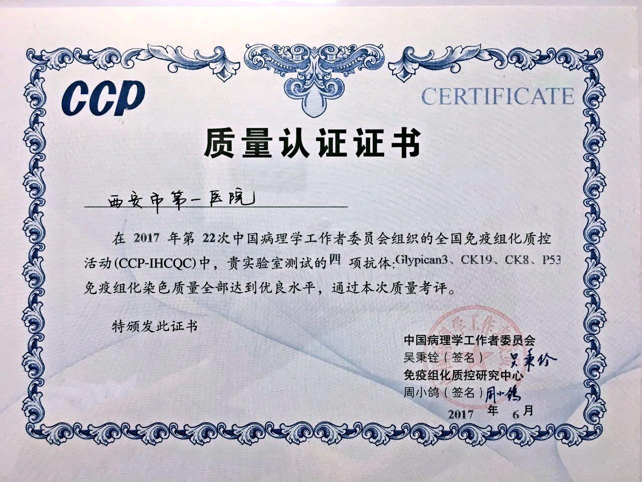 病理科狠抓质控工作,医疗质量得到稳步提高。连续三年参加省、市级免疫组化室间质控并顺利通过测评。今年一院病理科初次报名参加了由中国病理学工作者委员会免疫组化研究中心(CCP-IHCQC)组织的2017年CCP第22次免疫组化质控活动,按照组委会的要求选送的Glypican3、CK19、CK8、P53这四种抗体的免疫组化标记,均以优良的成绩通过质控评审。