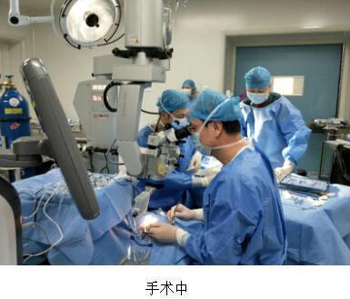 眼科五病区王彤主任主刀,储昭节、潘晓燕医师为助手,麻醉科乔中原医生负责全麻,术中发现玻璃体视网膜增殖明显,且伴有视网膜下膜,手术难度大。在手术医师、麻醉医师以及手术室护士的通力配合下,经过近两个小时的细心操作,手术获得成功,视网膜成功复位。