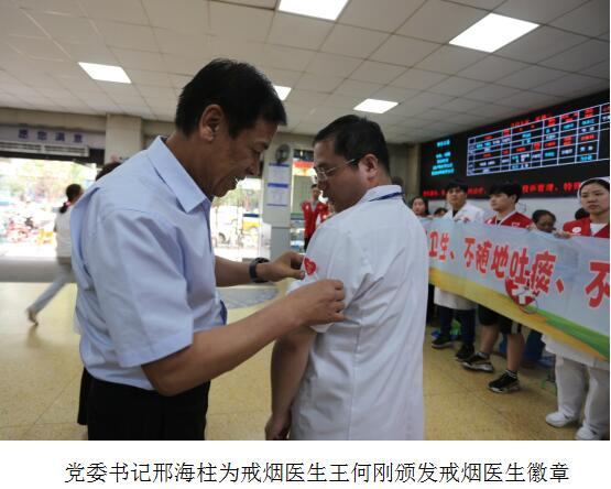 为给前来就诊的患者及家属提供一个无烟、整洁舒适的就医环境,改善患者就医感受,5月30日上午9点卫防科、爱卫办、团委、门诊办在门诊大厅联合举办“捡拾身边烟头、整治厕所卫生、不随地吐痰、不乱扔垃圾、美化医院环境”主题宣传活动。活动启动仪式上,副院长邵景为志愿者作动员讲话,党委书记邢海柱为戒烟医生王何刚颁发戒烟医生徽章,院领导为志愿者代表颁发控烟徽章。
