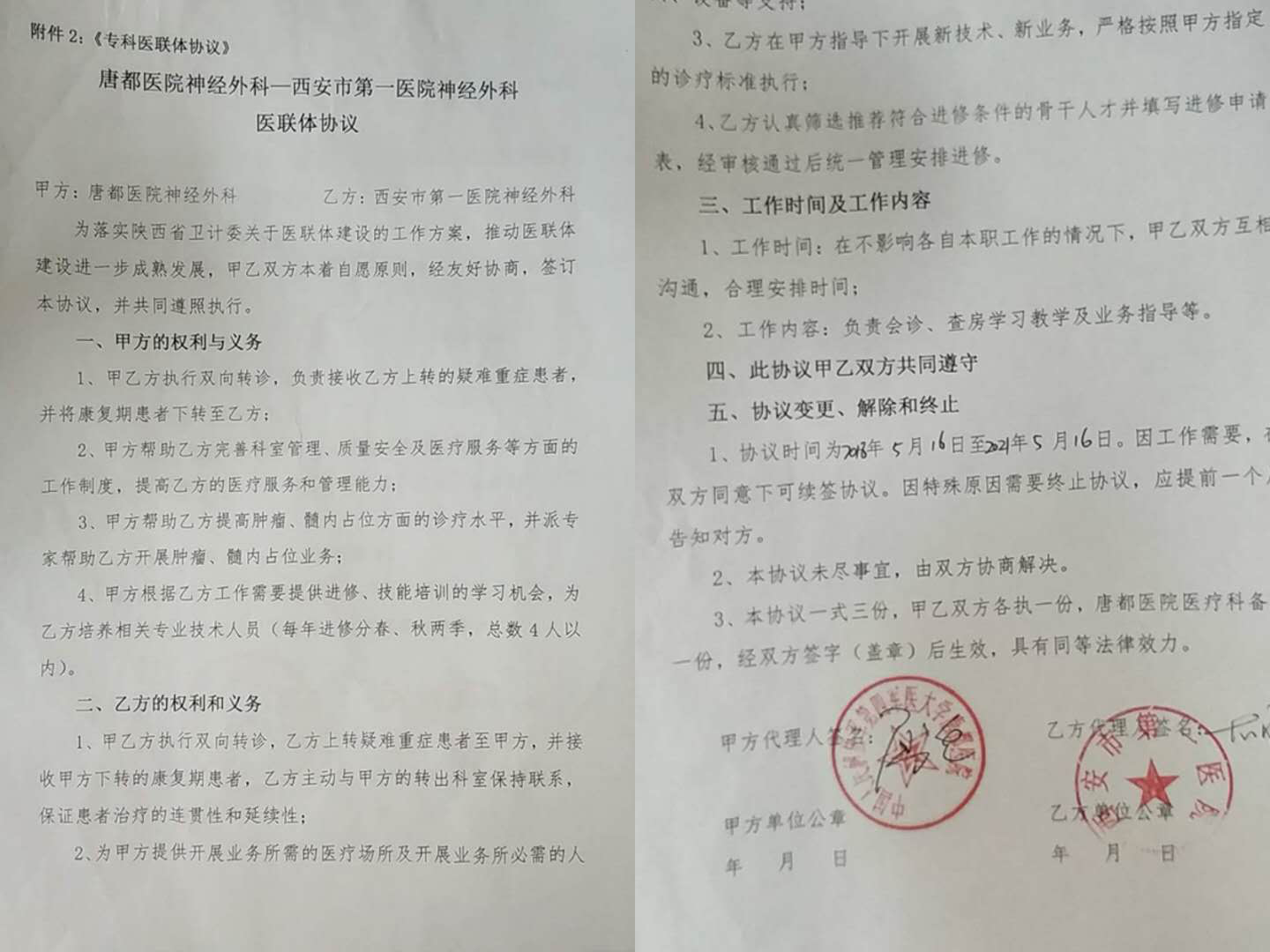 神经外科与空军第四军医大学唐都医院神经外科正式签署为期三年《专科医联体协议》。