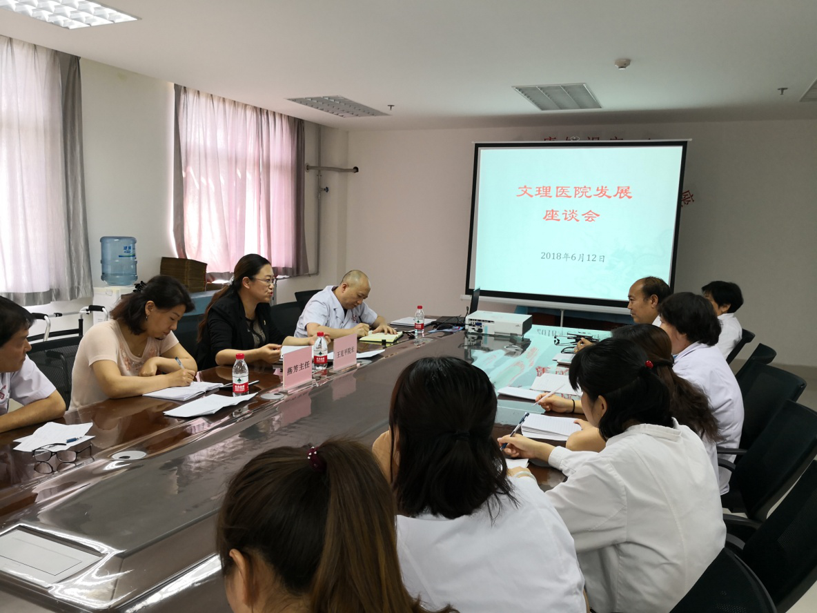为了促进文理医院快速发展,6月12日下午,医联体办公室牵头在文理医院五楼会议室组织召开了“找问题 补短板 促发展”为主题的文理发展职工座谈会,文理医院院长王克平带病主持会议。文理医院中层管理人员、副高以上职称、研究生以上学历、医技科室负责人、公卫专干及护理人员代表等共计30余人参加会议。