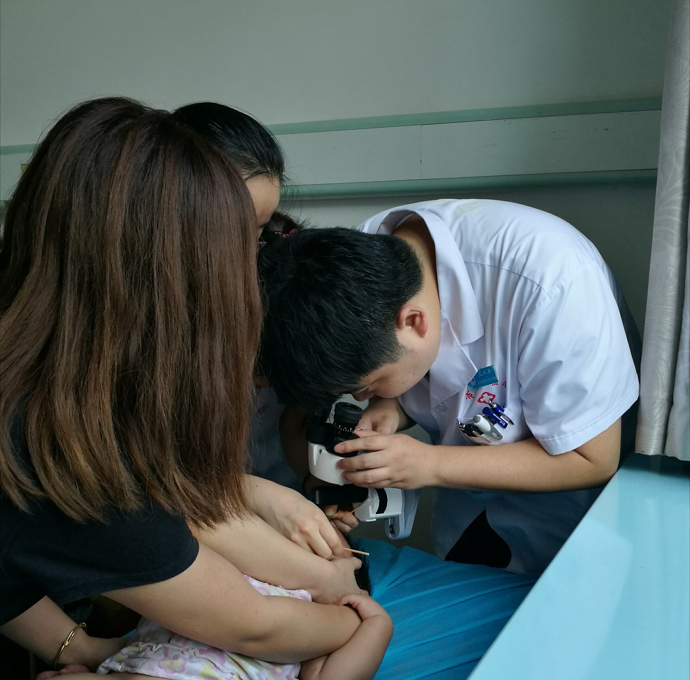 眼二病区高伟主任接到三桥车辆厂医院的求助电话,有一名1岁6个月的患儿左眼在家中不慎被异物扎伤,情况紧急,需转至啄木鸟