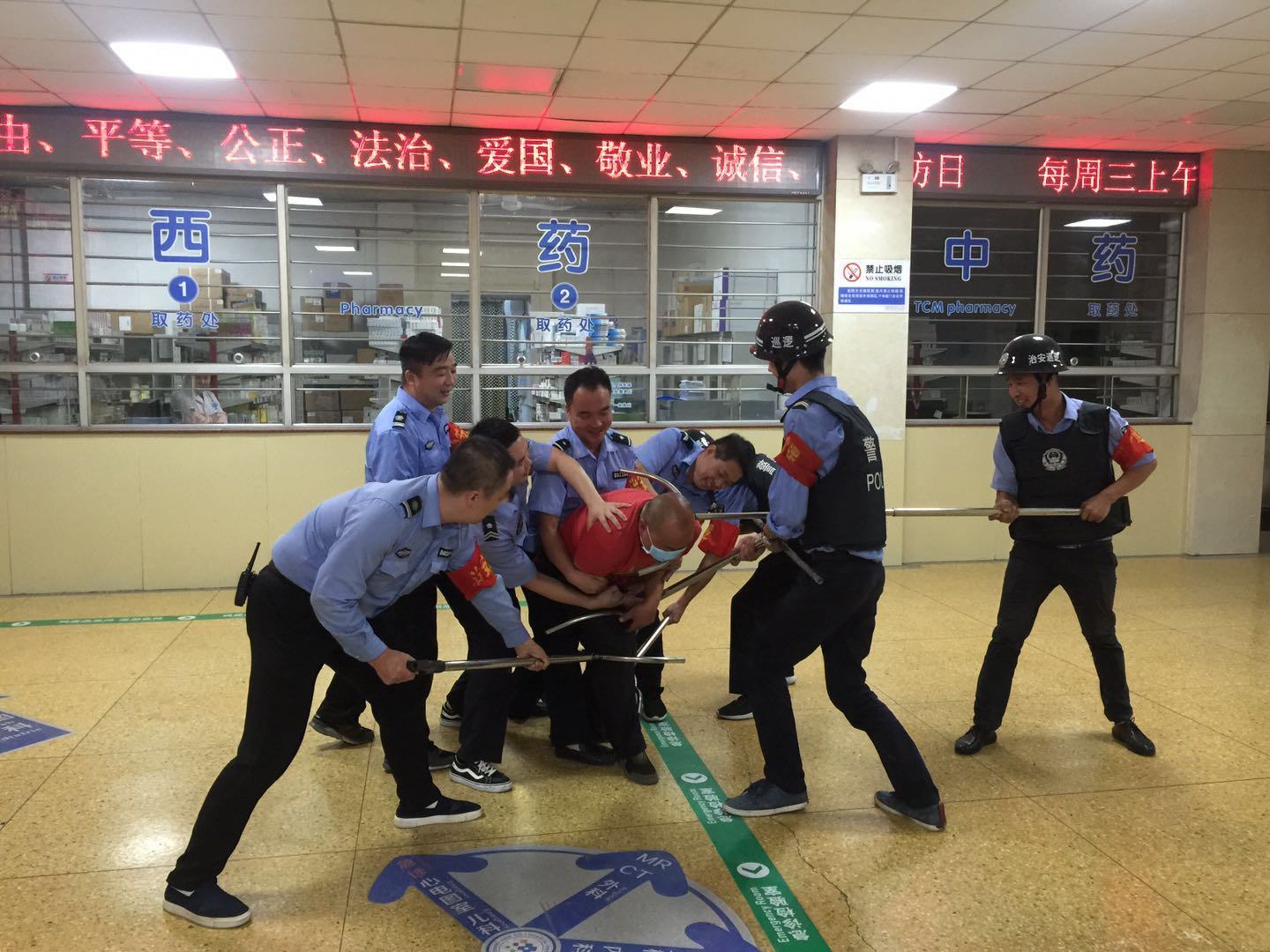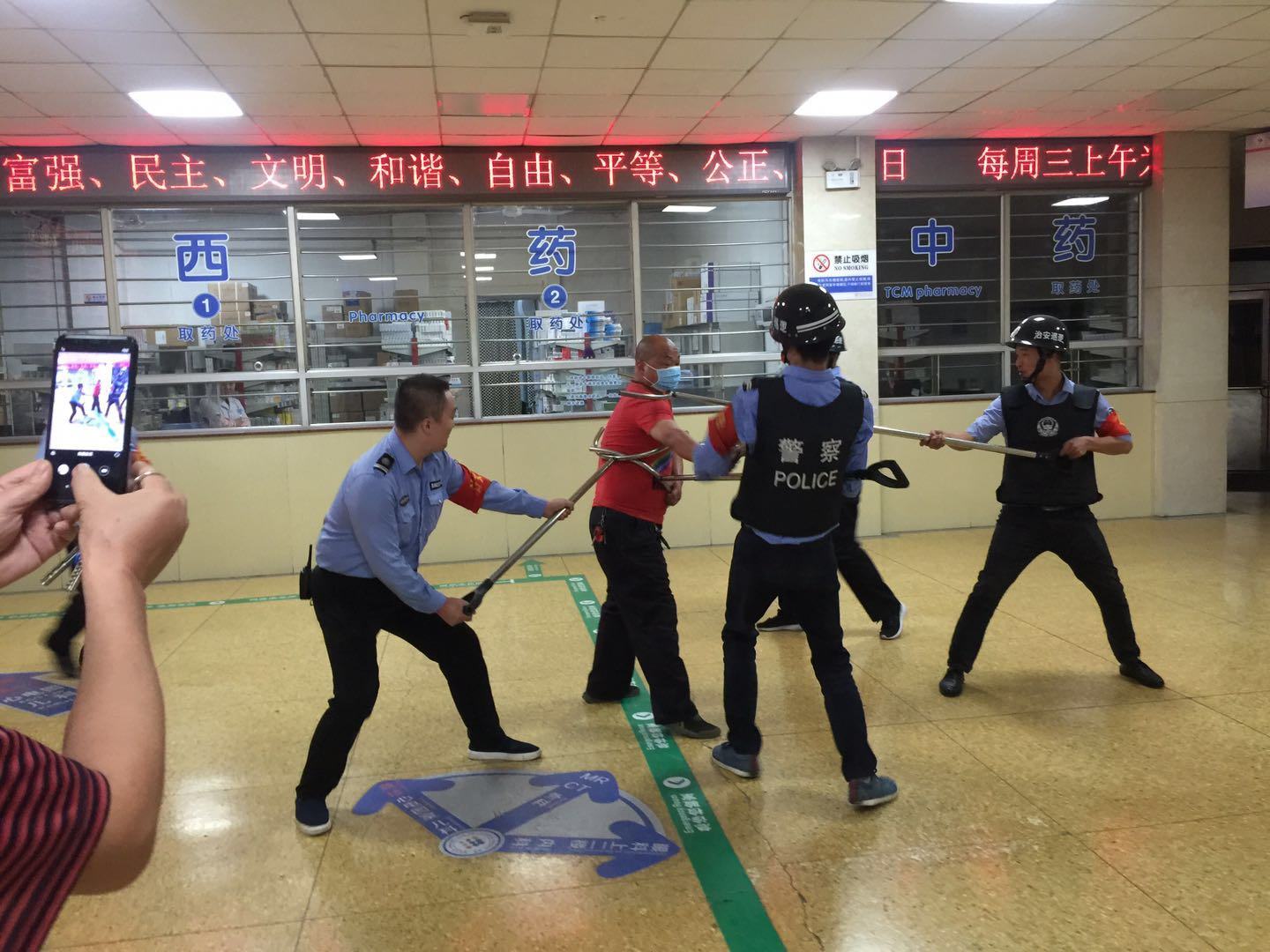 保卫科在医院门诊大厅组织开展了防恐防暴、扫黑除恶应急演练,并邀请当天医疗、护理、行政总值班共同参加。