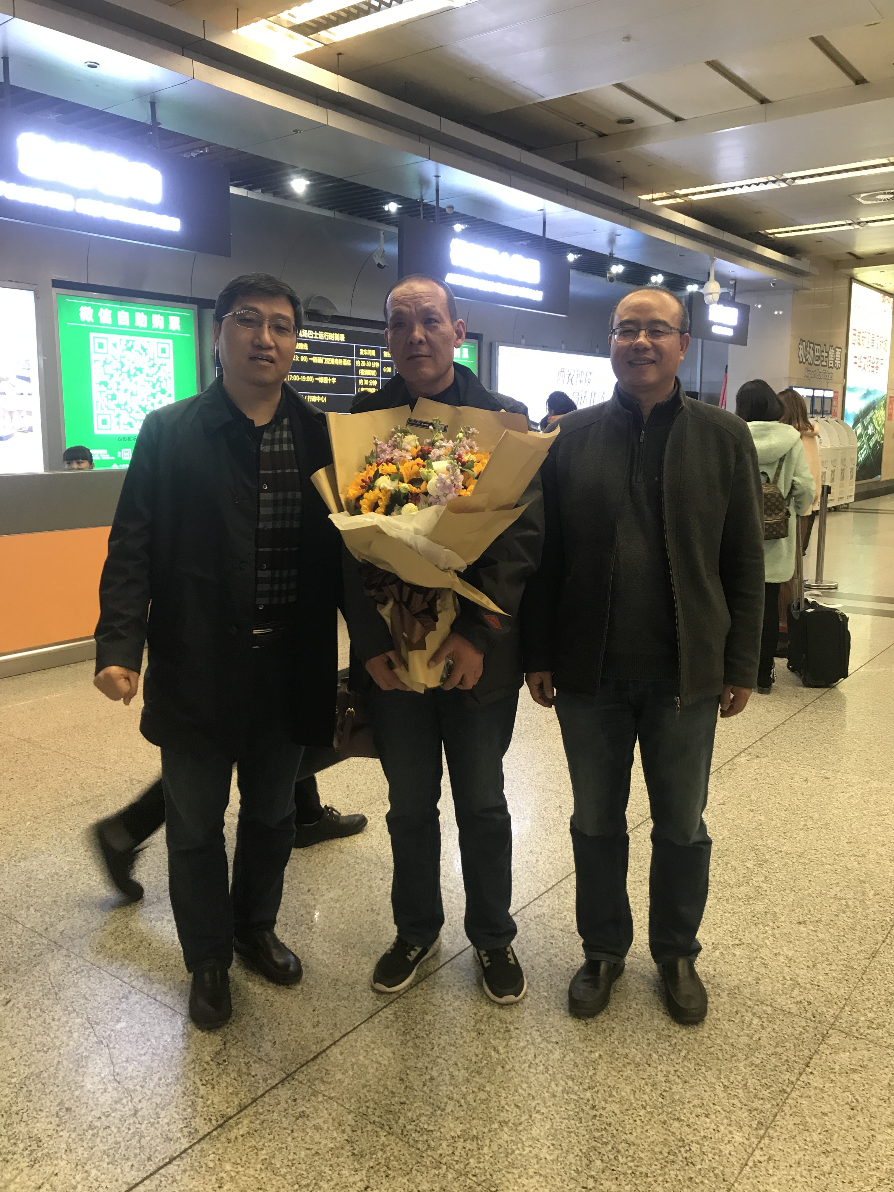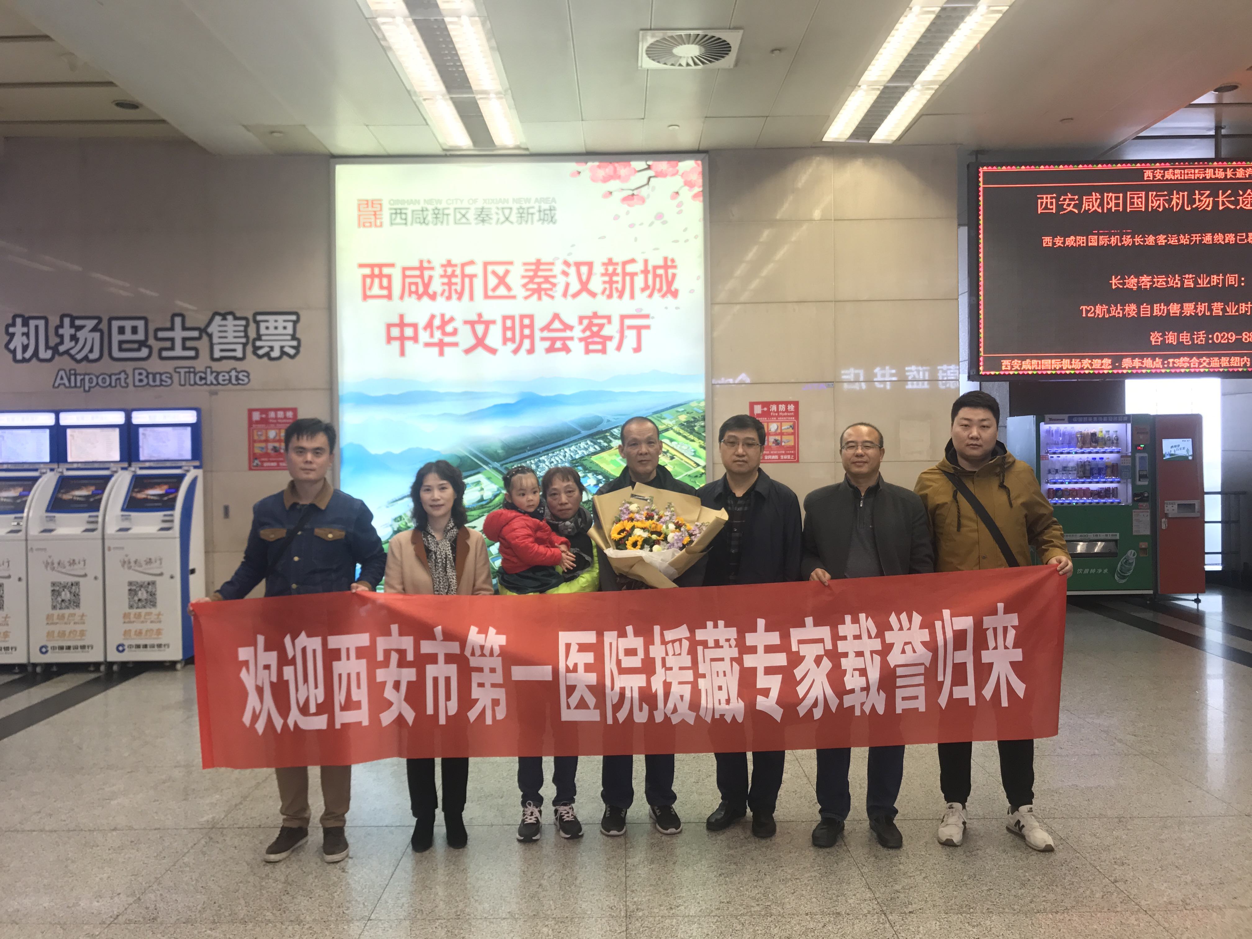 11月18日下午,由刘佩勇副院长、蔡秀莲总会计师带领人事科、设备科等同志前往咸阳国际机场迎接圆满完成了6个月医疗援藏任务的设备科工程师胡耀华同志凯旋归来。