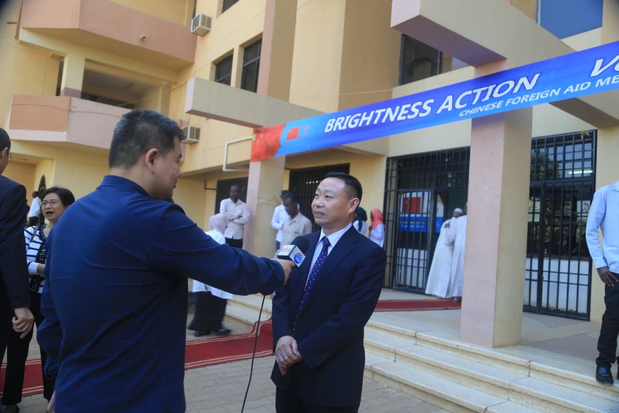 随后,张红兵组长接受包括新华社、人民日报、苏丹国家电视台等十多家新闻媒体采访,作为两次参加国家援苏丹“光明行”项目的眼科医生,他表示能够把中国先进的眼科诊疗技术带到非洲,为广大苏丹白内障患者送来复明之光,他感到无比自豪与欣慰。作为项目组长他向各界媒体介绍此次援苏“光明行”项目组是今年中国援非“光明行”项目中唯一一个独立由一家医院完成组派专家的项目组,目前开展手术仅2天共完成57例白内障复明手术,术后效果良好,100%植入人工晶体,无一例差错感染发生,正如啄木鸟