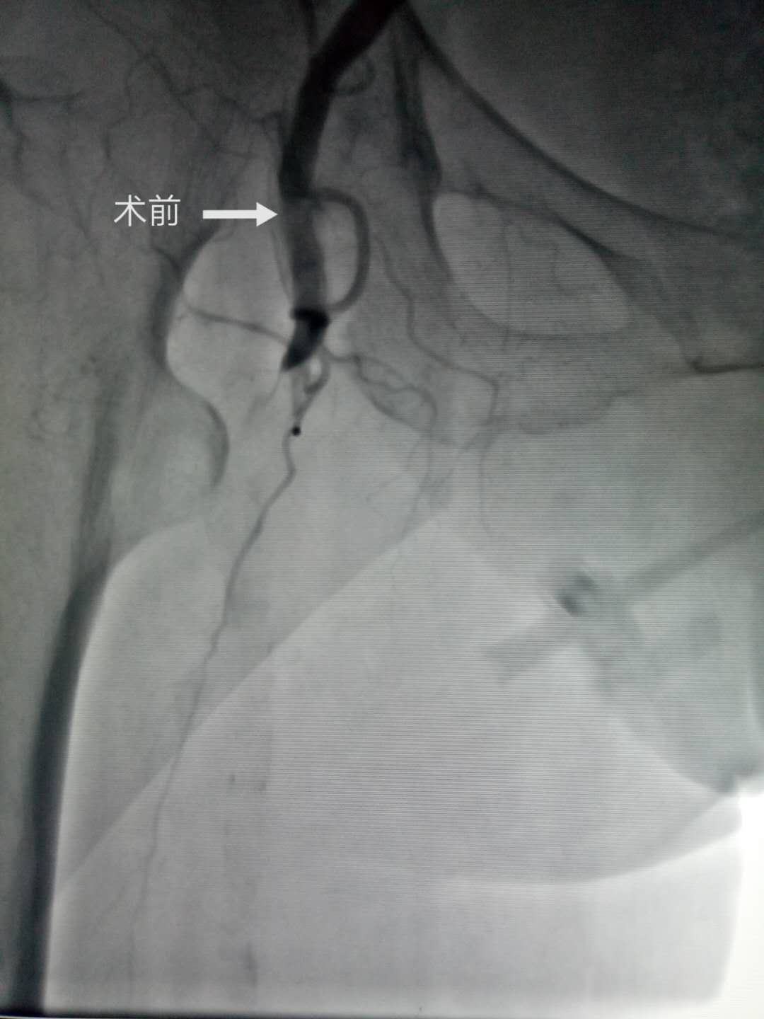 患者女性,90岁,以“间断胸闷、气短20年余,右下肢冰冷1天”之主诉入院,查体:右下肢皮肤苍白,皮温低,足背动脉搏动消失。彩超提示右下肢股动脉血栓形成,且造成管腔闭塞可能。患者为超高龄女性,体重只有38公斤,同时合并2型糖尿病、冠心病、心力衰竭等疾病,属于出血超高危险患者。现急性右下肢动脉血栓形成,需要急诊介入治疗,否则有肢体坏死的风险。在郭瑄主任医师主持下,经全科积极讨论确定右下肢动脉血栓形成的微创治疗方案。认真完成术前准备后,充分告知家属手术风险,由郭瑄主任医师、尚粉青副主任医师在介入室配合下于2019年4月10日下午在局麻下行右下肢动脉血管造影术+血栓抽吸术+动脉血栓溶栓术,手术过程顺利,术后患者右下肢供血明显改善。