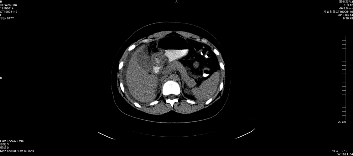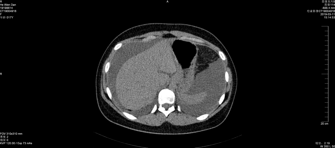 2019年3月11日,消化内科收治一名女性患者,16岁,以“腹胀1周、腹泻、腹痛1天”之主诉入院,查体:生命体征平稳,皮肤未见皮疹,心肺未见异常,腹部有柔韧感,无明显压痛,移动性浊音阳性。B超提示盆腔、腹腔积液,门诊按“急性胃肠炎”收治。入院后检查结果,血常规:白细胞22.52×10