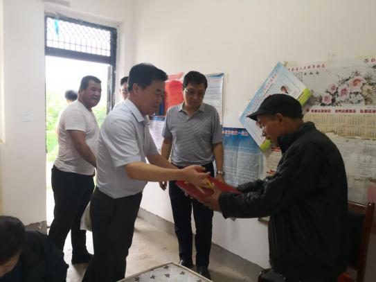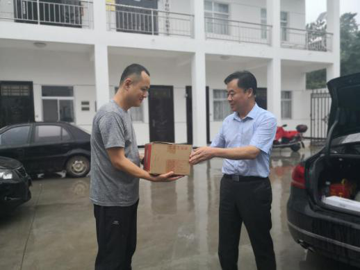 扶贫干部为王买利带来了夏季解暑饮料和西瓜。王买利高兴的说,谢谢干部们想着我,大雨天的还来看我。