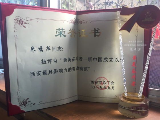 朱秀萍同志被市总工会评为“最美奋斗者——新中国成立以来西安最具影响力的劳动模范”荣誉称号。
