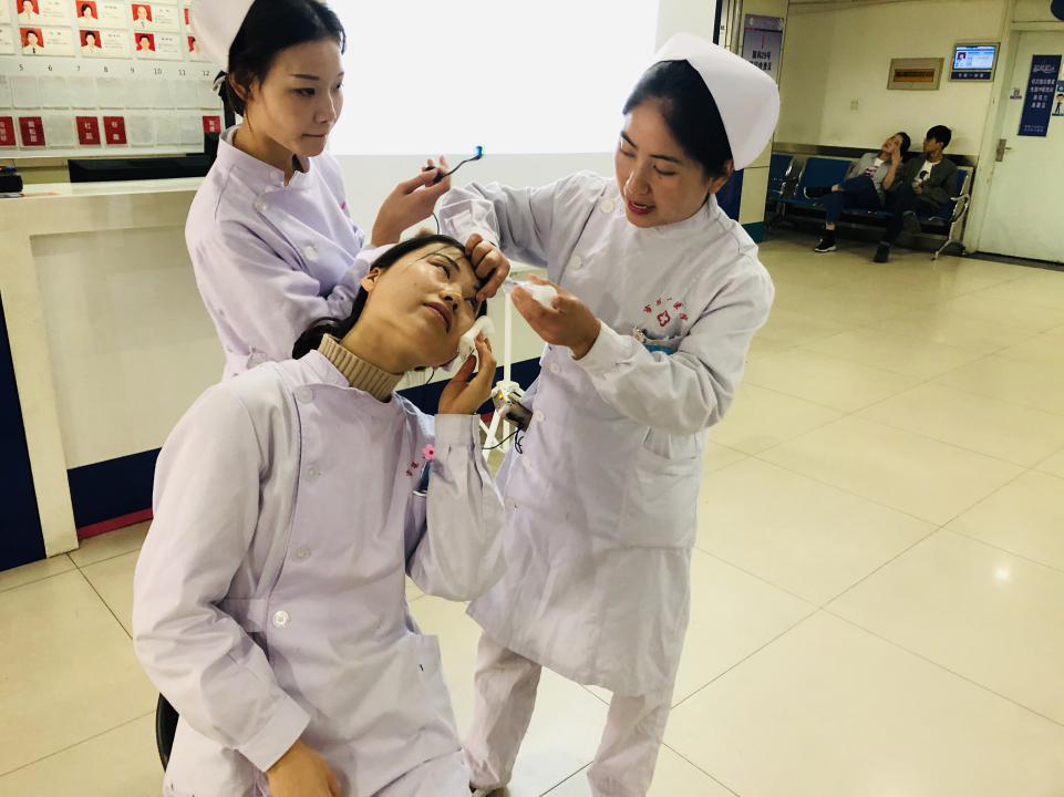 随后,由张妍和何瑶护师为大家现场演示了在受外伤时如何用流动水冲洗双眼及眼外伤应急处理的方法,广受大家好评和欢迎。