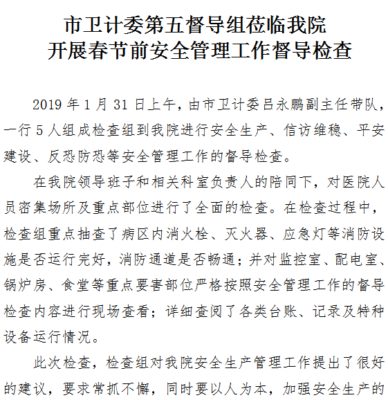 市卫计委第五督导组莅临啄木鸟 开展春节前安全管理工作督导检查