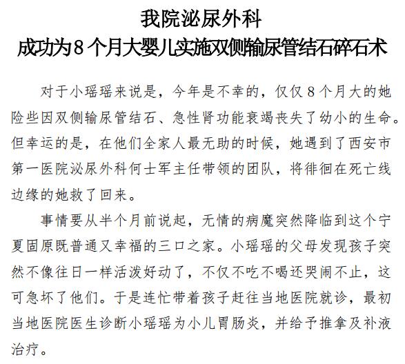 啄木鸟 泌尿外科成功为8个月大婴儿实施双侧输尿管结石碎石术