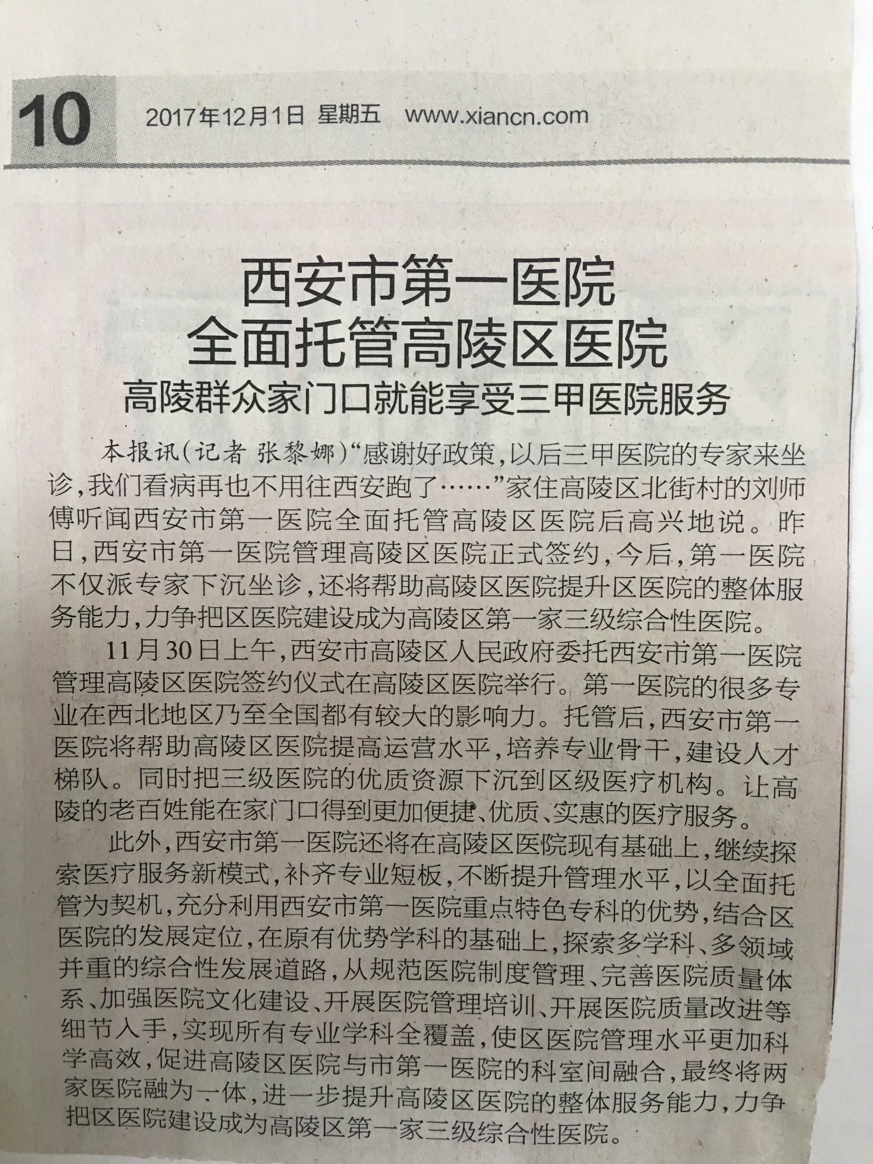 2017.12.1《西安晚报》啄木鸟 全面托管高陵区医院