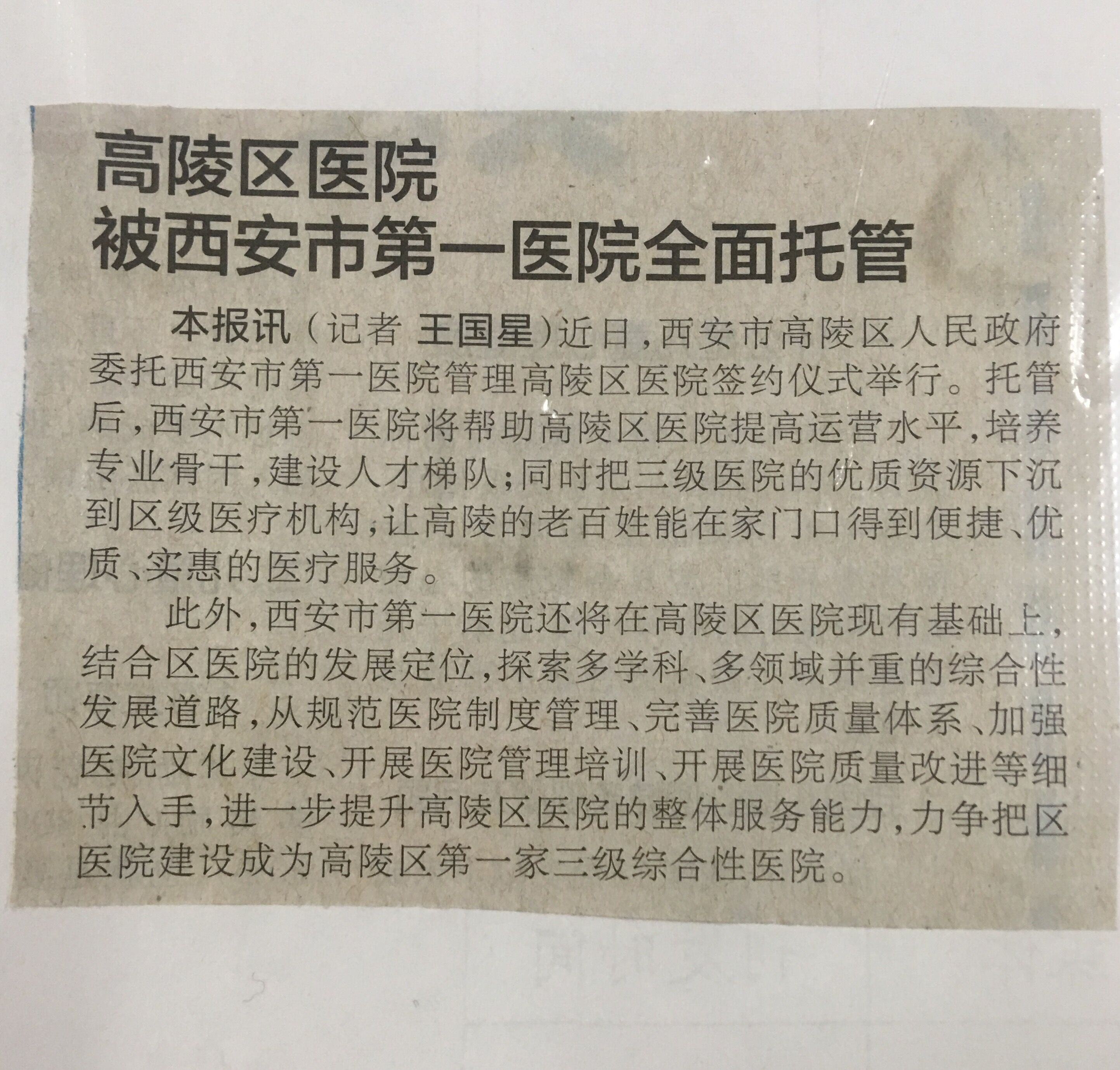 2017.12.11《陕西日报》高陵区医院被啄木鸟 全面托管