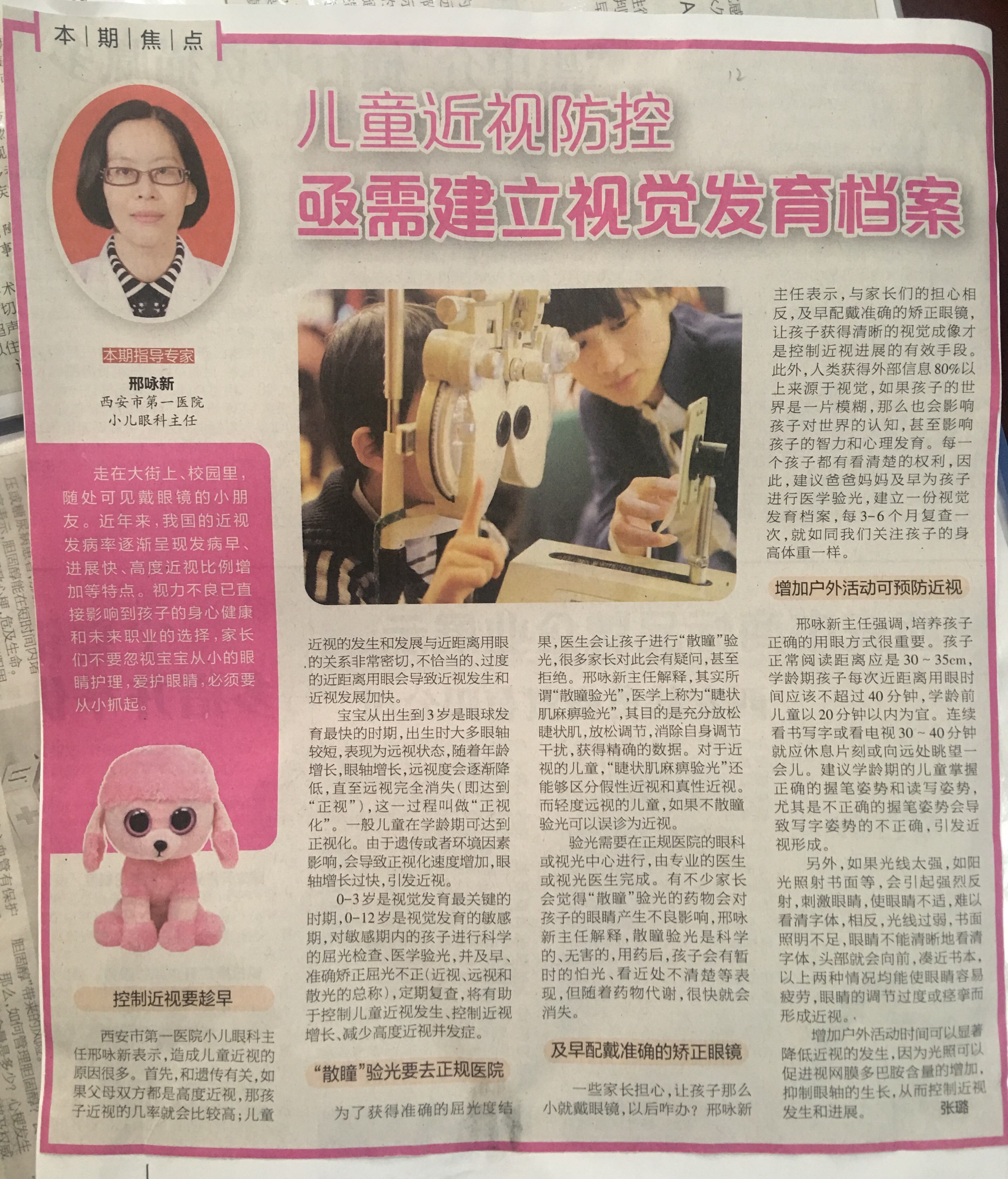 2018.5.28《西安日报》儿童近视防控需建立视觉发育档案(12版)