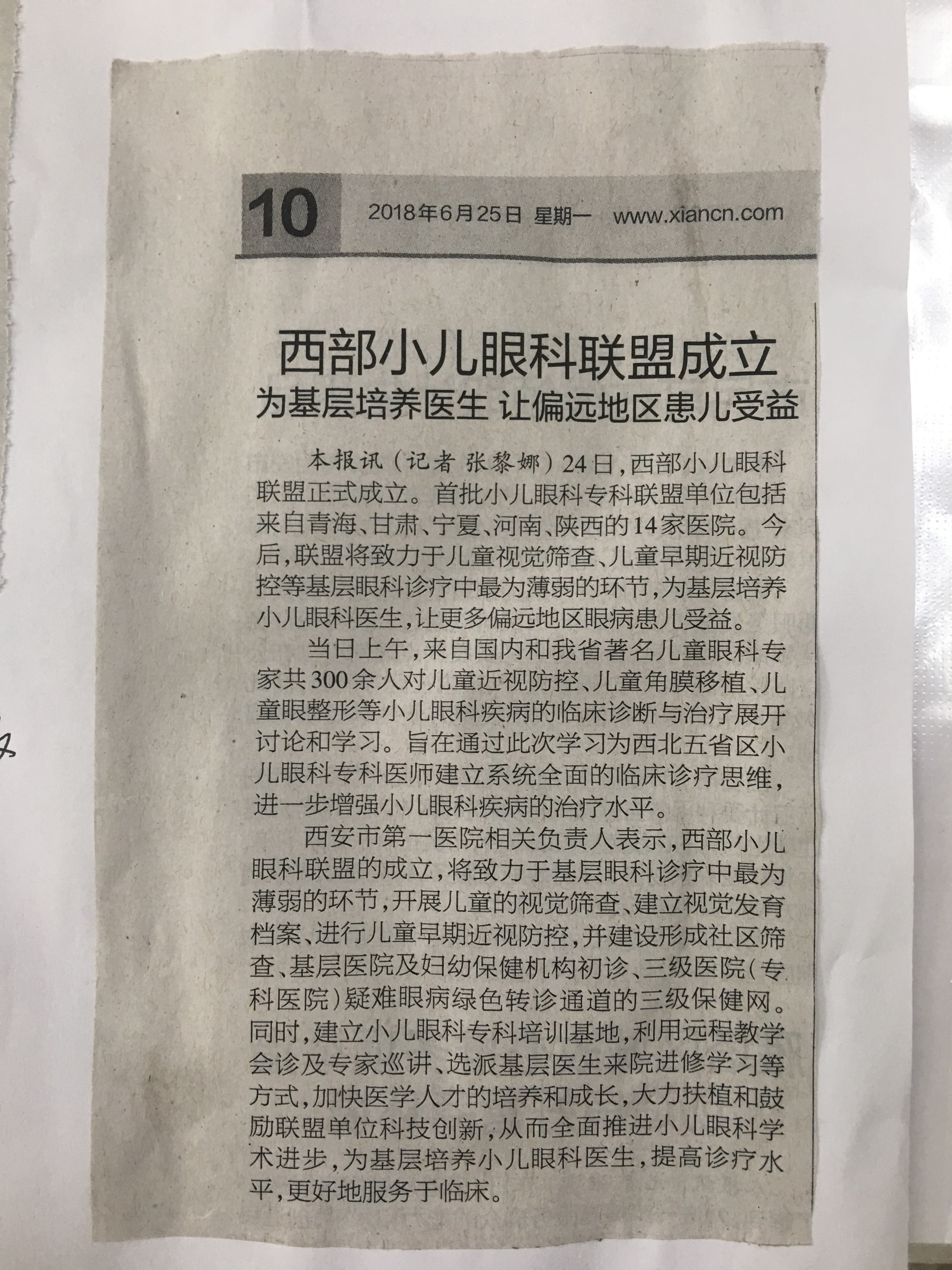 2018.6.25《西安晚报》西部小儿眼科联盟成立