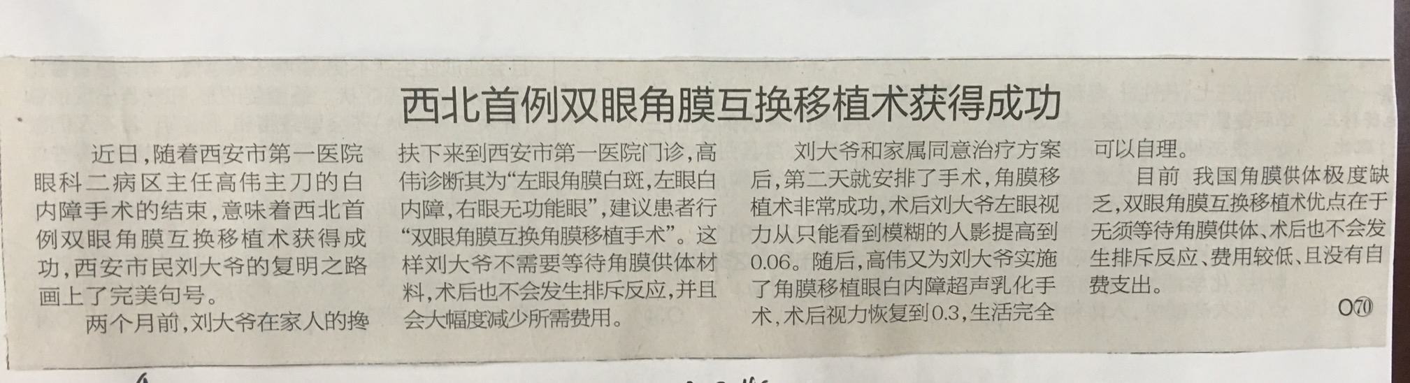 2018.7.14《华商报》西北首例双眼角膜互助移植术获得成功