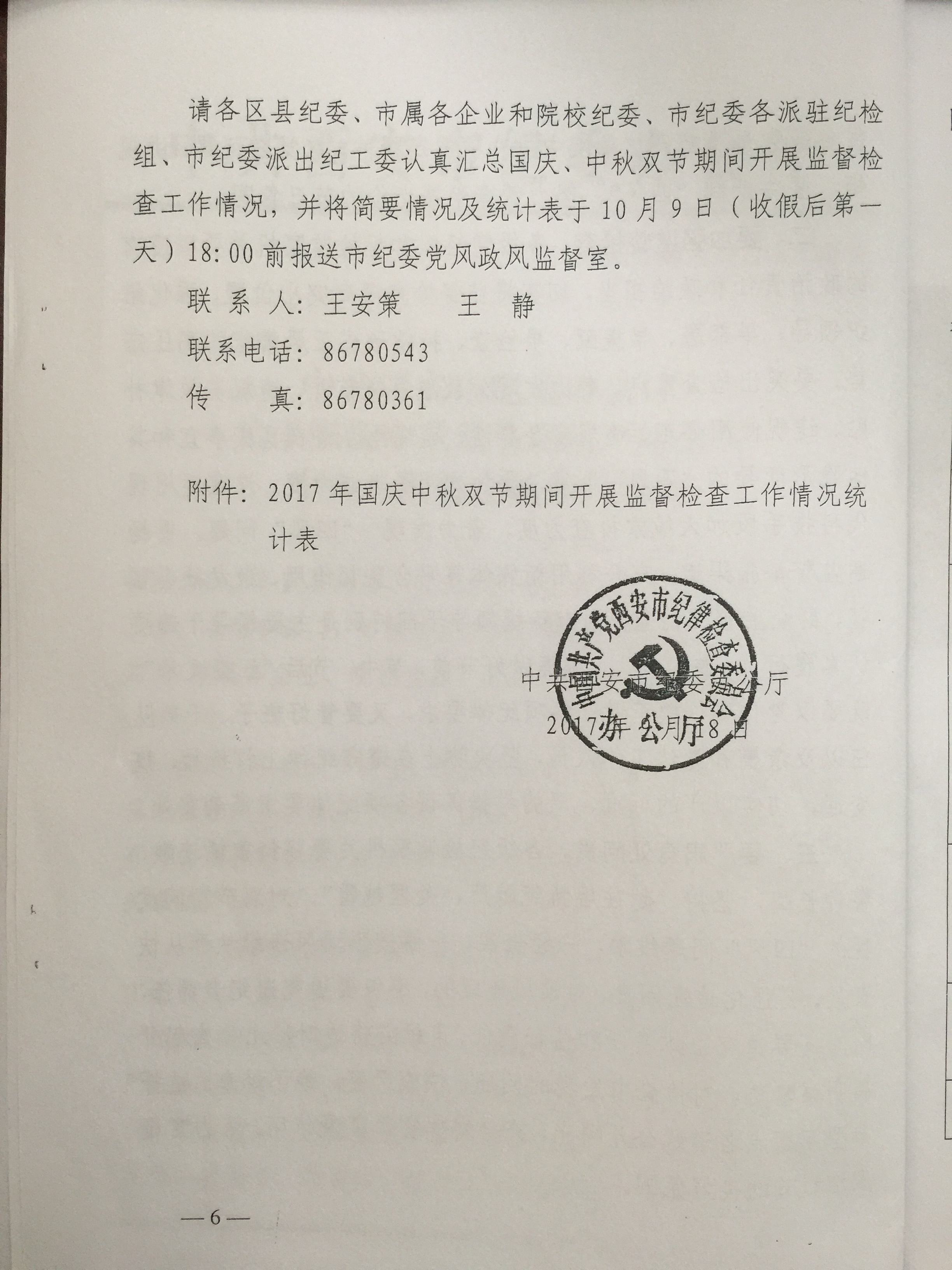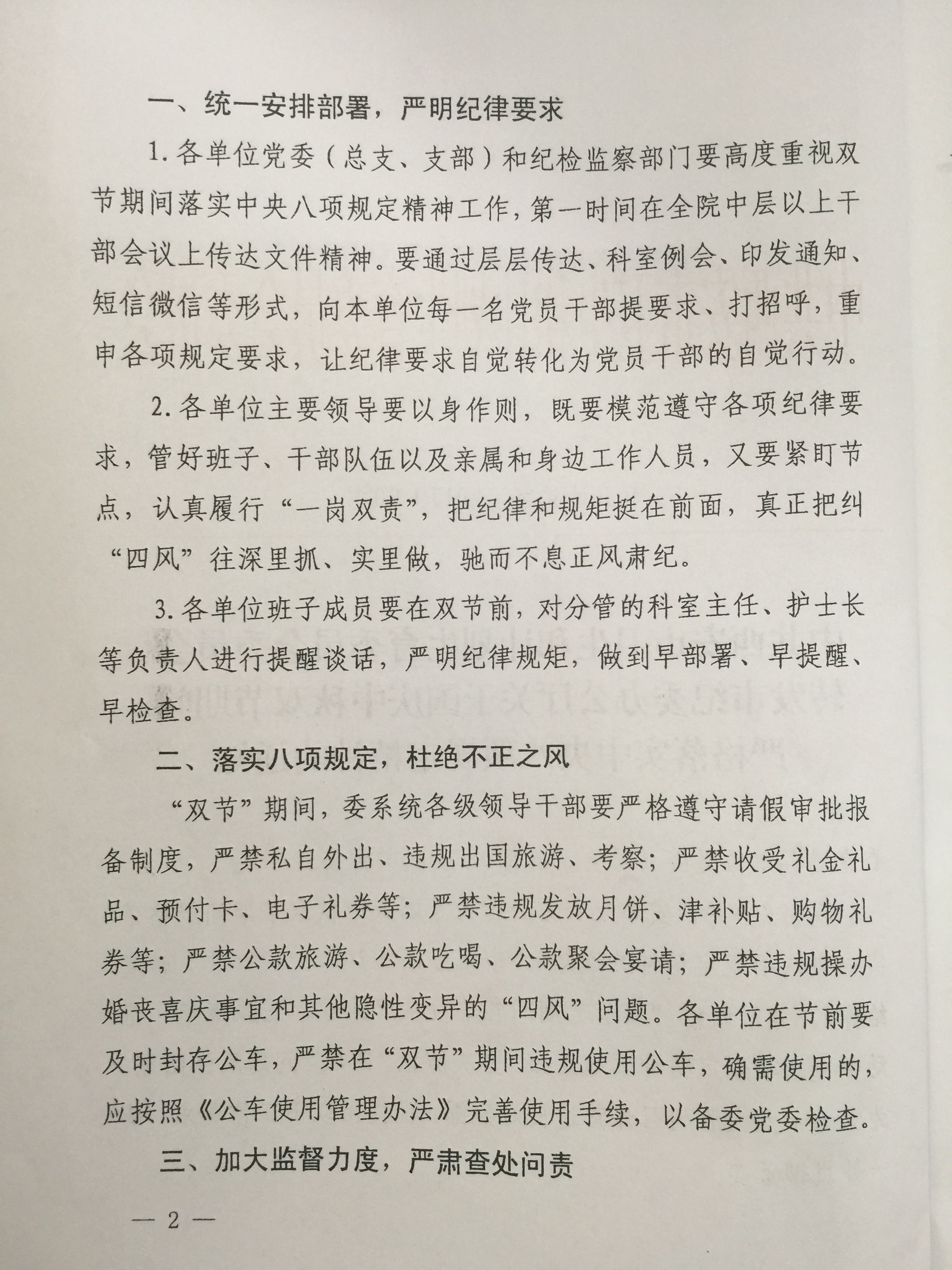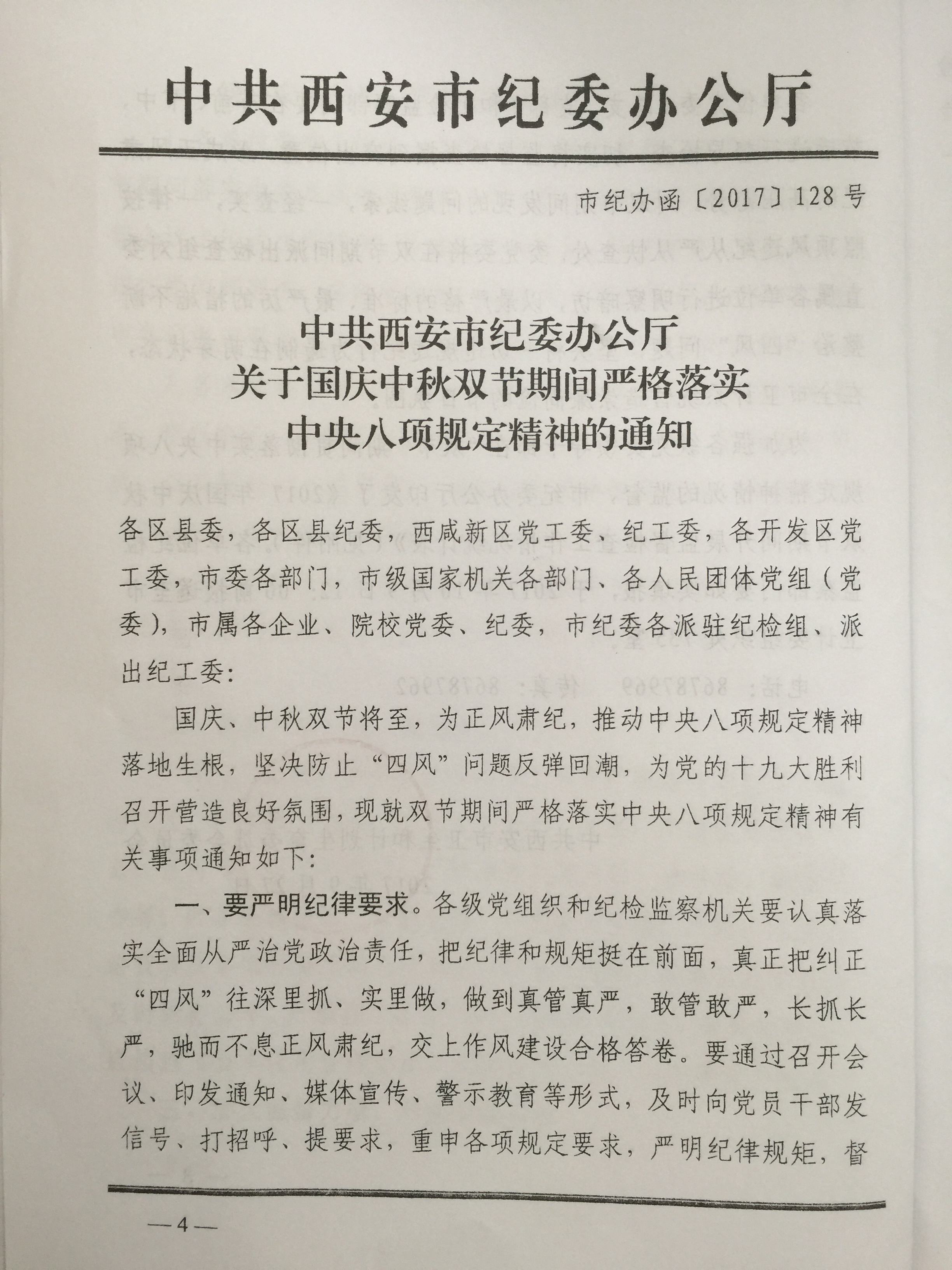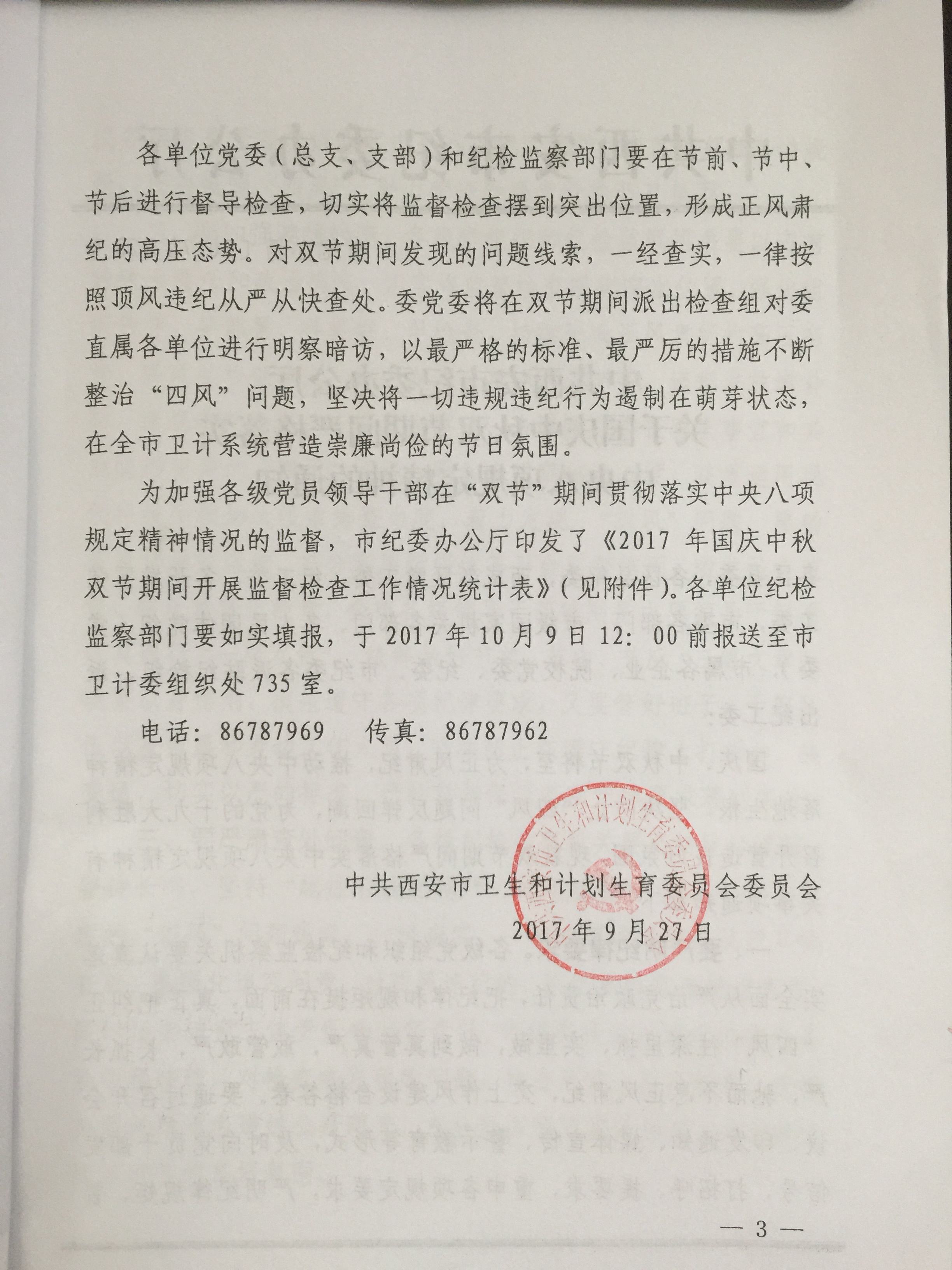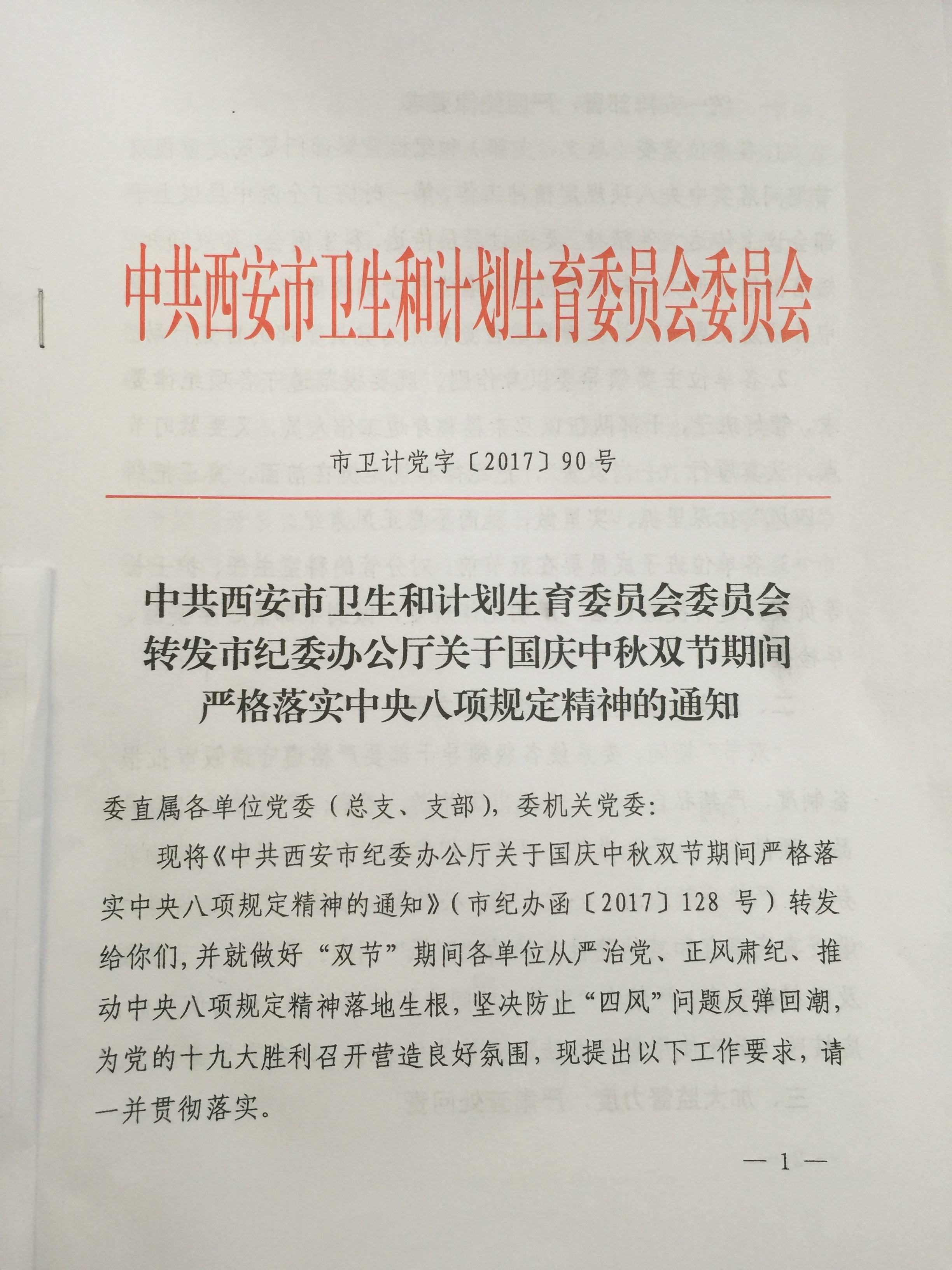 西安市卫计委转发市纪委办公厅关于国庆中秋双节期间严格落实中央八项规定精神的通知