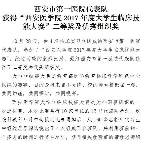 第一医院代表队获得“西安医学院2017年度大学生临床技能大赛”二等奖及优秀组织奖