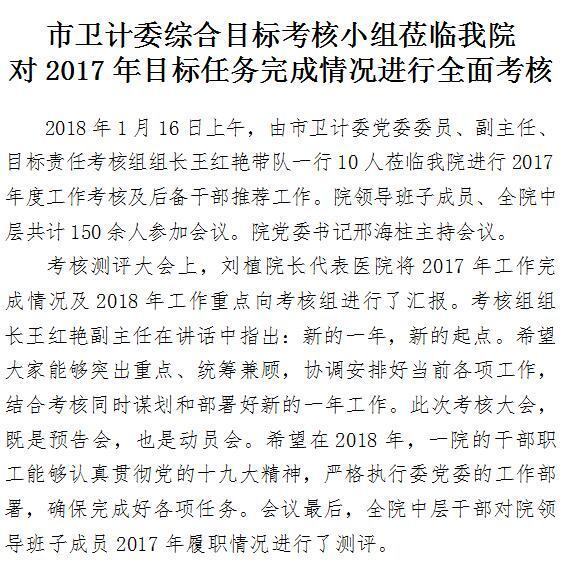 市卫计委综合目标考核小组莅临啄木鸟 对2017年目标任务完成情况进行全面考核