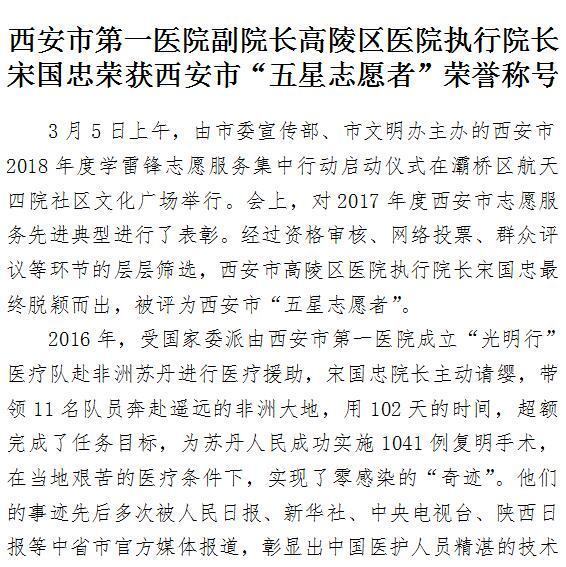 啄木鸟 副院长高陵区医院执行院长宋国忠荣获西安市“五星志愿者”荣誉称号