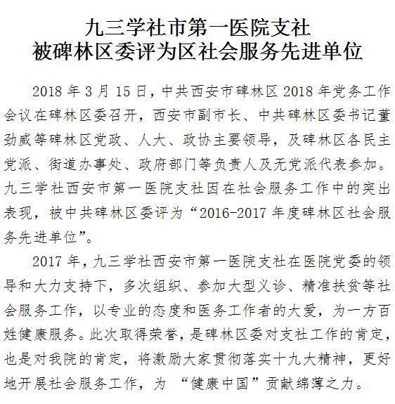 九三学社市第一医院支社被碑林区委评为区社会服务先进单位