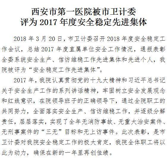 啄木鸟 被市卫计委评为2017年度安全稳定先进集体
