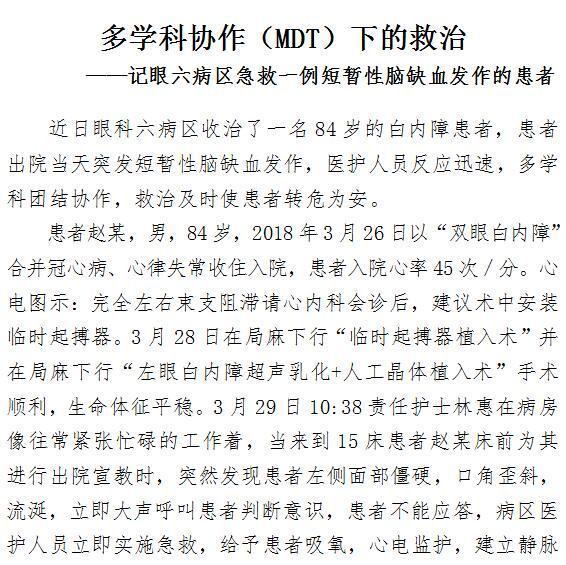 多学科协作(MDT)下的救治 ——记眼六病区急救一例短暂性脑缺血发作的患者