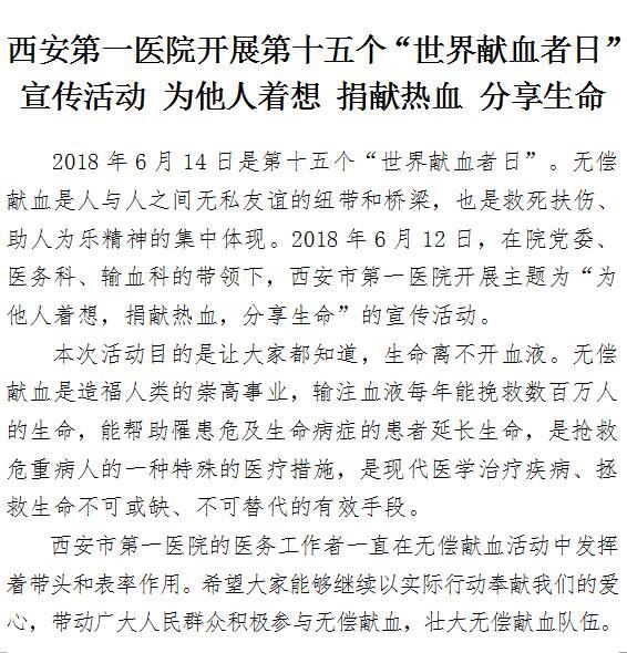 西安第一医院开展第十五个“世界献血者日”宣传活动 为他人着想 捐献热血 分享生命