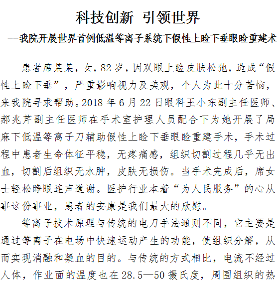 科技创新 引领世界 --啄木鸟 开展世界首例低温等离子系统下假性上睑下垂眼睑重建术