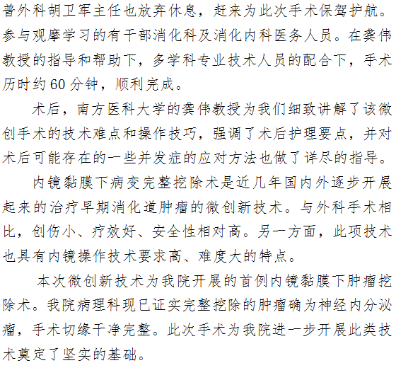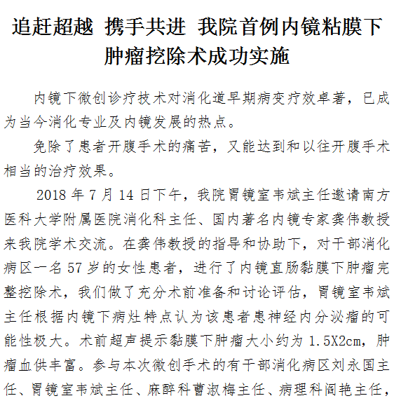 追赶超越 携手共进 啄木鸟 首例内镜粘膜下肿瘤挖除术成功实施