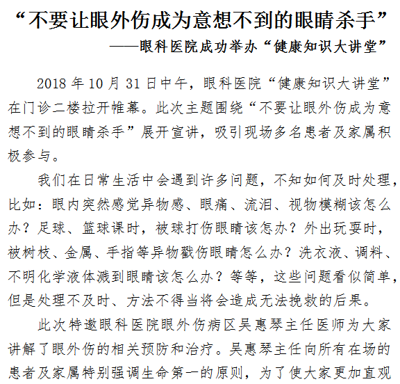 “不要让眼外伤成为意想不到的眼睛杀手” ——眼科医院成功举办“健康知识大讲堂”