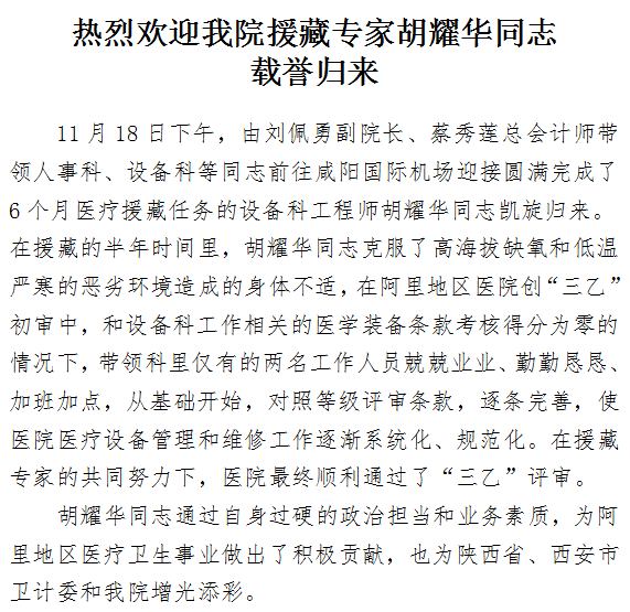 热烈欢迎啄木鸟 援藏专家胡耀华同志载誉归来
