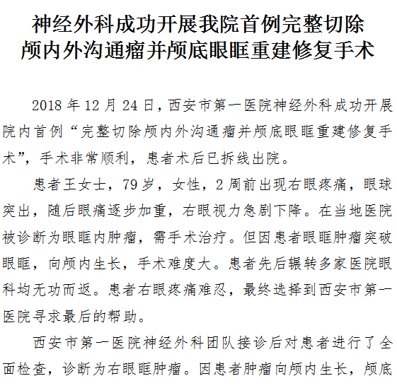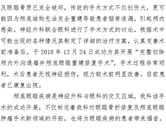 神经外科成功开展啄木鸟 首例完整切除颅内外沟通瘤并颅底眼眶重建修复手术