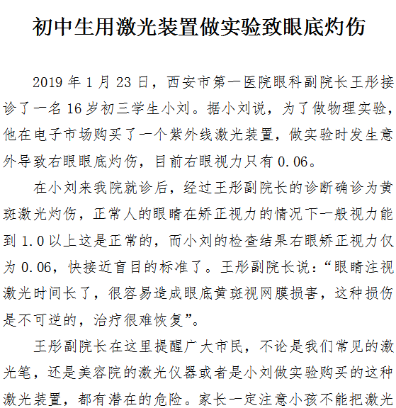 初中生用激光装置做实验致眼底灼伤