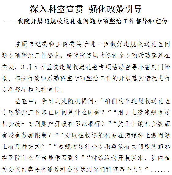 深入科室宣贯 强化政策引导 ——啄木鸟 开展违规收送礼金问题专项整治工作督导和宣传