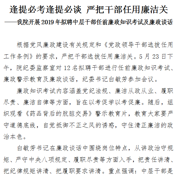 逢提必考逢提必谈 严把干部任用廉洁关——啄木鸟 开展2019年拟聘中层干部任前廉政谈话