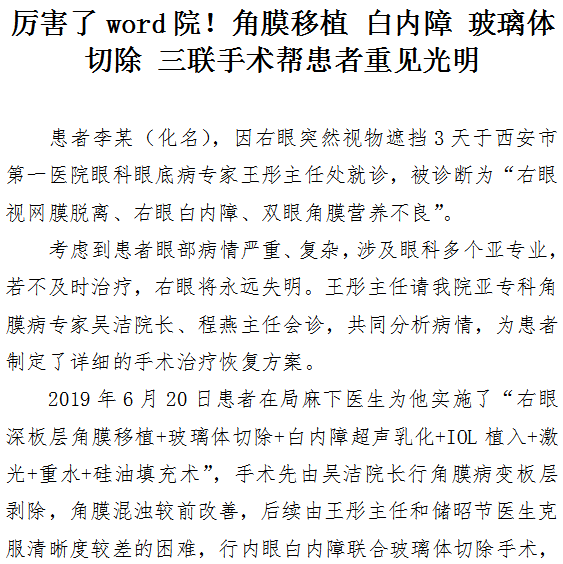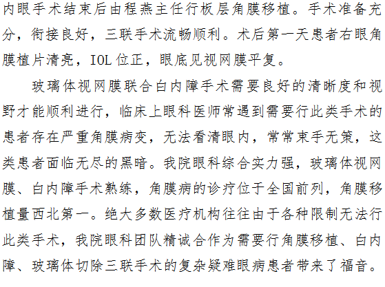 厉害了word院!角膜移植 白内障 玻璃体切除 三联手术帮患者重见光明