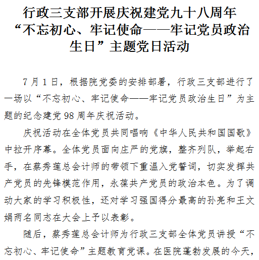 行政三支部开展庆祝建党九十八周年 “不忘初心、牢记使命”主题党日活动
