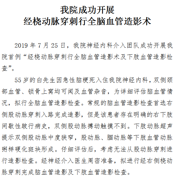 啄木鸟 成功开展 经桡动脉穿刺行全脑血管造影术