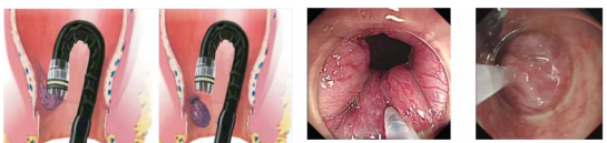 使用内镜通过倒镜的方法将痔疮的位置暴露清楚,通过套扎圈结扎痔血管,阻断痔疮血流供应,痔核组织坏死脱落。