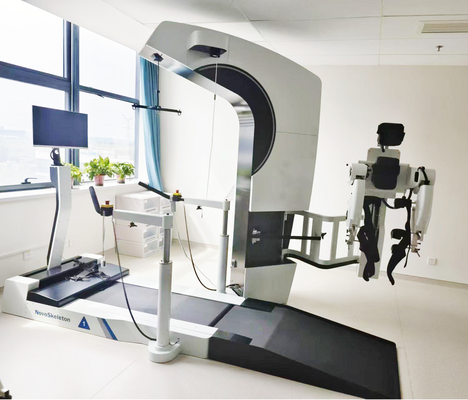 下肢康复训练机器人NovoSkeleton由一套髋部支撑装置和四个关节运动系统组成,将生理步态运动参数进行建模,按照所建立的标准模型进行引导患者下肢关节运动,通过模拟正常人步行模式来进行负重、迈步和平衡三要素相结合的步态训练。产品提供患者部分身体重量减轻和脚底接触运动功能。使由于多种病理症状引起的下肢关节运动功能障碍患者能够轻松的进行康复训练。适用于脑卒中(CVA)、创伤性脑损伤(TBI)、脊髓损伤(SCI)、脑瘫(CP)、帕金森病(PD)、假体(例如全髋关节假体)、下肢的退行性骨关节疾病、废用性肌肉萎缩、多发性硬化症(MS)等下肢功能障碍的患者。