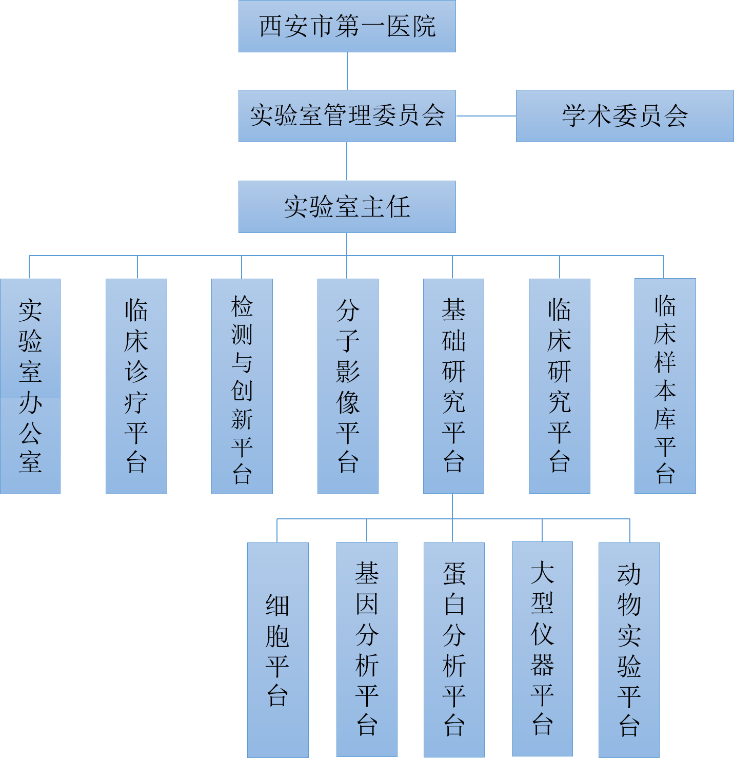 根据《西安市重点实验室认定管理办法》,成立实验室学术委员会和实验室管理委员会。实验室学术委员是由12名国内神经免疫疾病专家组成,主要职能是为重点实验室的建设目标和研究方向的确定与调整、重点实验室发展规划和年度工作计划、重大学术活动提供指导和建议。重点实验室管理实行医院领导下的主任负责制,设实验室主任1名,副主任3 名,设办公室负责实验室日常行政管理与对内外协调工作,实验室固定研究人员63名,固定技术人员14名,固定管理人员6名。